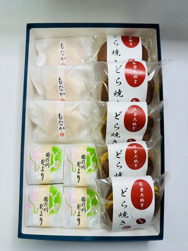 当店人気のどらやきと、厳選された黒ごまを十分に練り上げた黒ごま餡入りの最中、蜜漬けした小豆と栗が中にある、寒天を使った透明感あるお菓子がはいったお菓子のつめあわせになっております。 ■商品名:百万石花園屋菓子セット(B) ■内容量:どら焼き5個、菊乃川4個、黒胡麻最中3個 ■原材料名: 【どらやき】能登大納言かのこ、北海道大粒小豆、砂糖、小麦粉(国内製造)、卵、ハチミツ/膨張剤、乳化剤(一部に小麦、卵・乳成分を含む) 【菊乃川だより】大納言小豆(北海道産)、砂糖、水飴、栗甘露煮、寒天/トレハロース 【柚子最中】白いんげん豆、砂糖、水飴、トレハロース、柚子ペースト、餅米(国産) 【黒胡麻最中】小豆(北海道産)、砂糖、米飴、トレハロース、胡麻ペースト、餅米(国産) ■日持ち どら焼き:発送日より12日間 黒胡麻最中:発送日より15日間 菊乃川だより:発送日より30日間 ・国内発送のみとなります。 ・ご入金確認後の発送となります。 ■製造販売者 百万石花園屋 石川県金沢市城南2丁目3番14号